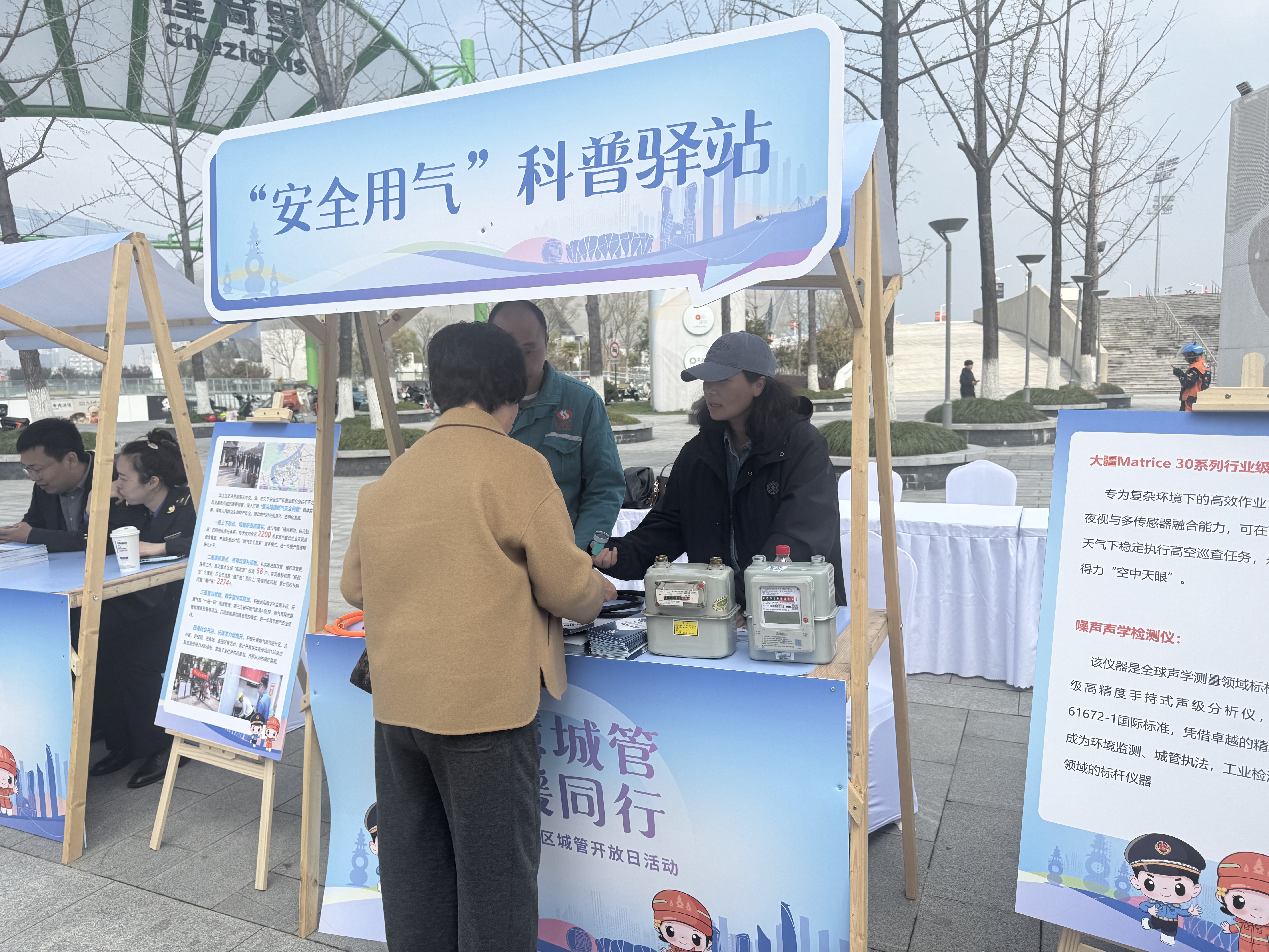活动期间,分公司工作人员提前到场、分工协作,同步开展安全宣传咨询与智慧设备展示。在宣传咨询区,工作人员设立咨询台,配合区城管局发放宣传资料、进行现场讲解。居民管理员吴小燕围绕燃气设备正确使用、燃气泄漏自检、应急处置等要点,用通俗语言和真实案例向居民、商户及企业员工细致讲解,并逐一解答群众关于日常用气、隐患排查、报修流程等疑问,将安全知识送到群众身边,切实增强公众安全防范意识。