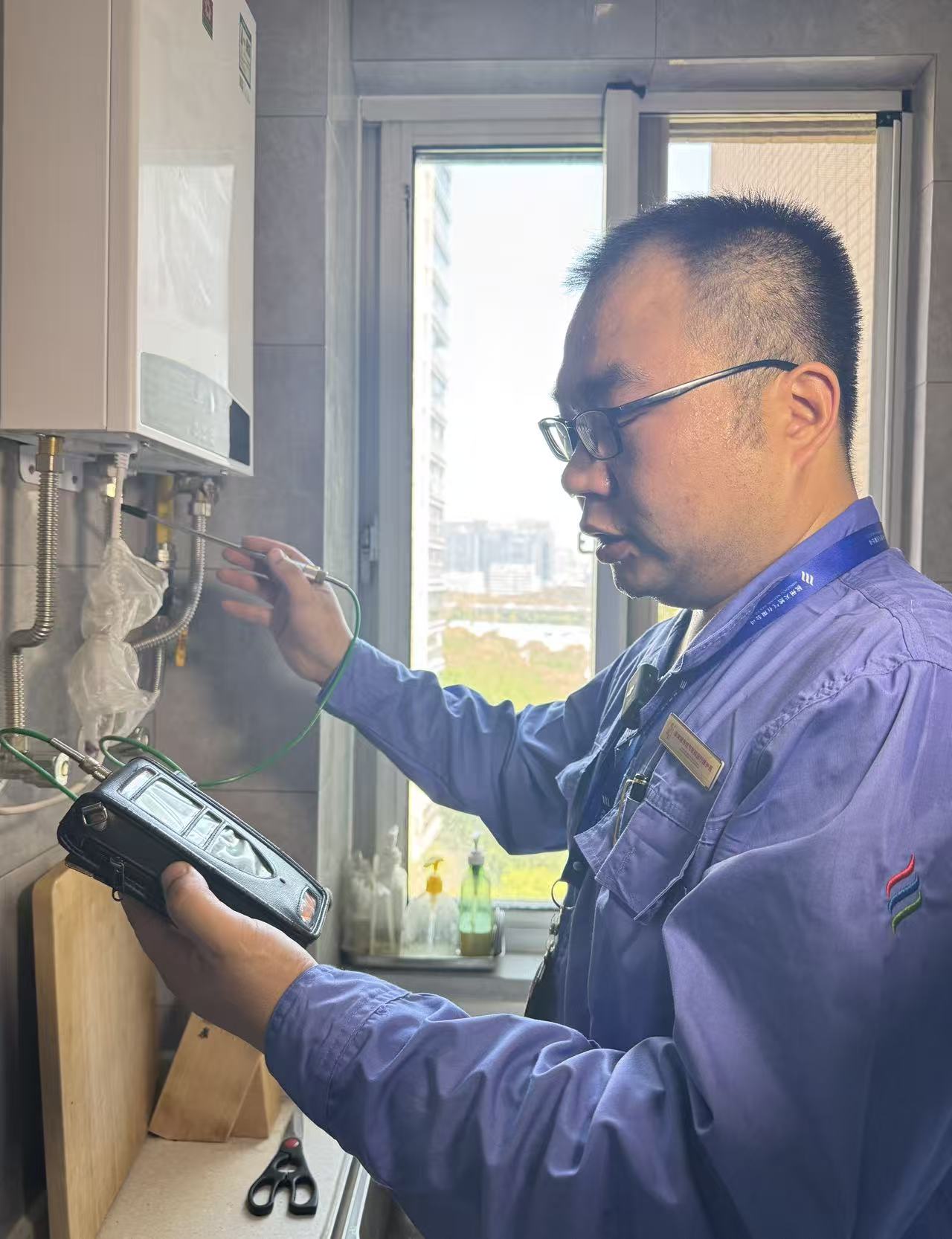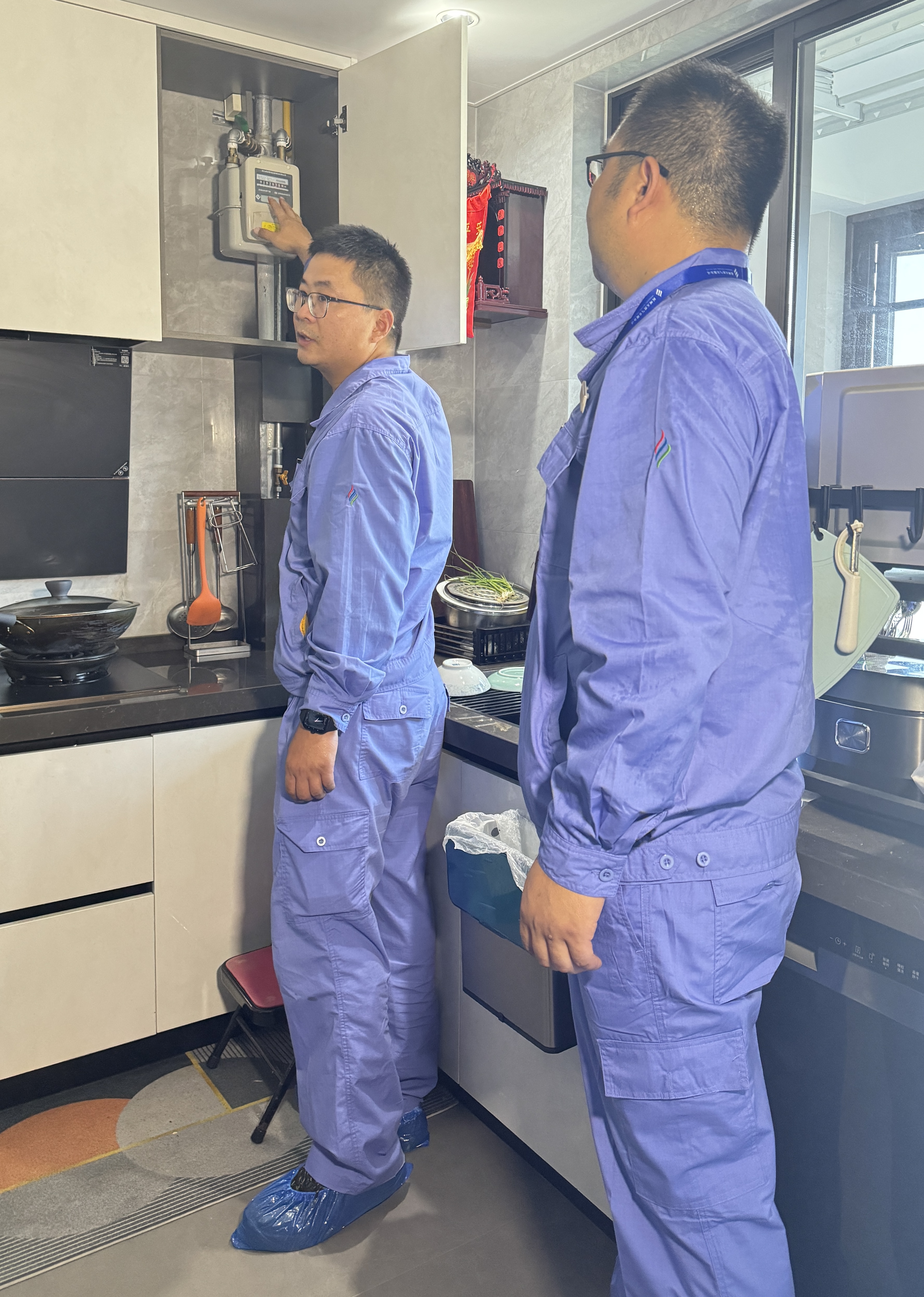 今天上午,滨江分公司中低压管网运行员来佳杰、傅建飞一如往常开启入户服务工作。在江照华庭小区,傅建飞携带专业工具敲开居民闻女士家的门,此次任务是为其更换老旧燃气表。“您家的燃气表已使用超过10年,表盘读数逐渐不准确,且密封件在高温下易老化,存在安全风险。”