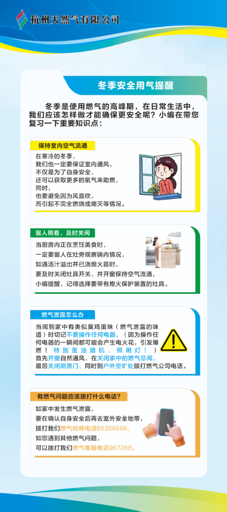 杭州天然气有限公司滨江分公司向全区市民做出郑重承诺:居民诉求100%受理、安全隐患100%整改,对冬季燃气安全事故零容忍! 如果您遇到任何用气问题,欢迎随时拨打24小时蓝焰热线:967266。